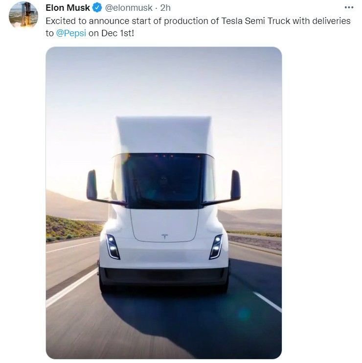 โดยทาง Elon Musk ผู้บริหารสูงสุดของ Tesla (Technoking) ได้โพสผ่านทวิตเตอร์ เมื่อช่วงเช้าของวันที่ 7 ตุลาคม 2565 ตามเวลาของประเทศไทยว่า "มีความตื่นเต้นเป็นอย่างยิ่งที่จะประกาศว่า Tesla Semi ได้เริ่มเดินสายการผลิตอย่างเป็นทางการแล้ว และจะเริ่มส่งมอบให้กับเป๊ปซี่ ในวันที่ 1 ธันวาคม 2022 นี้ พร้อมโพสภาพของ Tesla Semi สีขาว