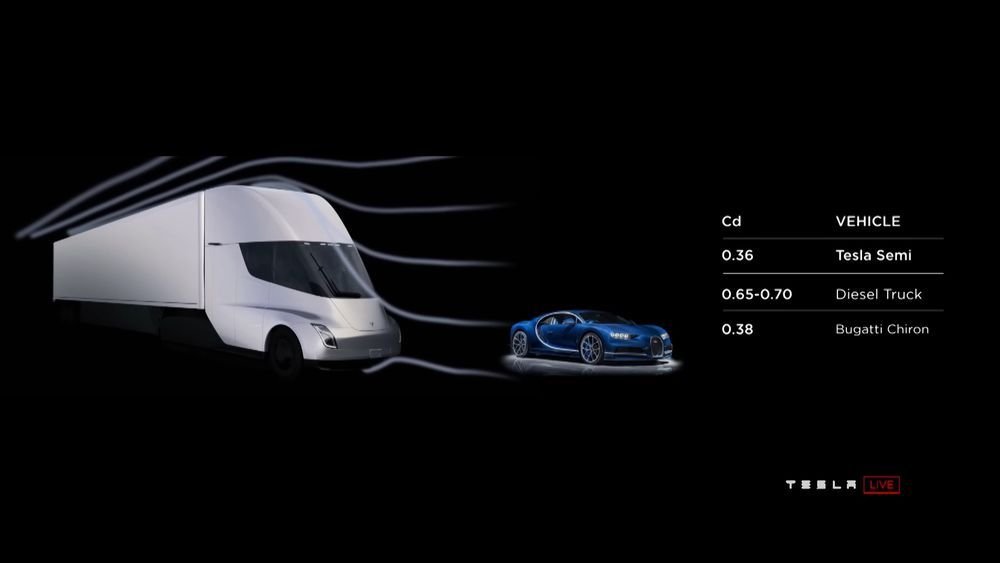 จุดเด่นของ Tesla Semi นั่นคือเรื่องของอากาศพลศาสตร์ โดยตัวรถมีค่าสัมประสิทธิ์แรงเสียดทานเพียง 0.36 เท่านั้น ต่ำกว่ารถไฮเปอร์คาร์อย่าง Bugatti Chiron ที่มีค่าสัมประสิทธิแรงเสียดทาน 0.38 และถ้าเปรียบเทียบกับรถบรรทุกเครื่องยนต์ดีเซลปกติ จะมีมากถึง 0.65 - 0.70 เลยทีเดียว